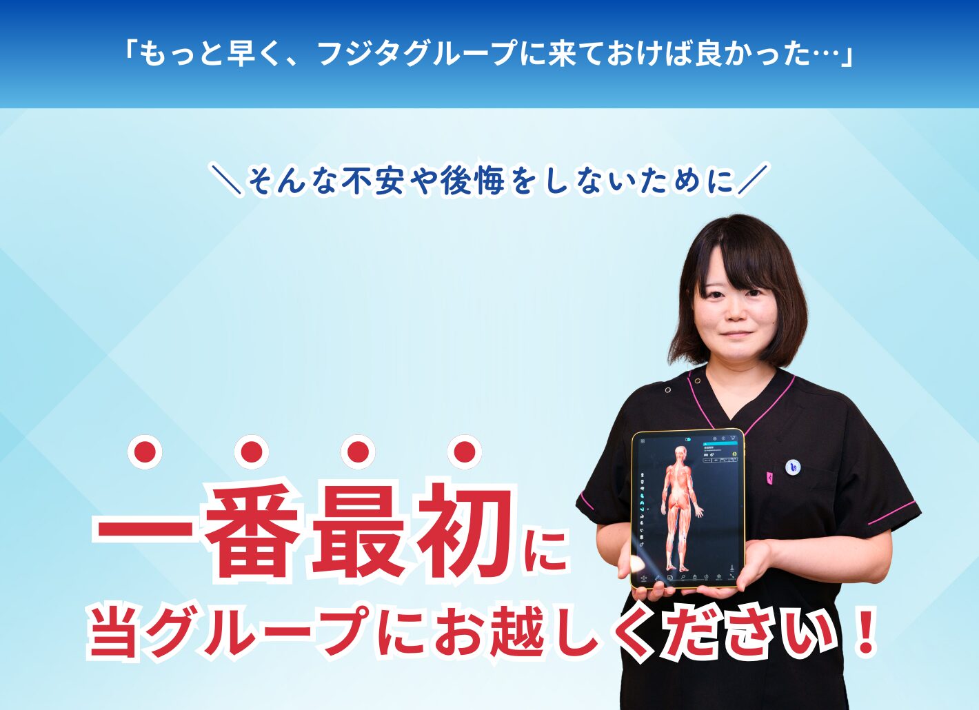 フジタグループは「健康こそ最大の資産」という考えのもと、後遺症を残さない・痛みを繰り返さない身体づくりを大切にしています
