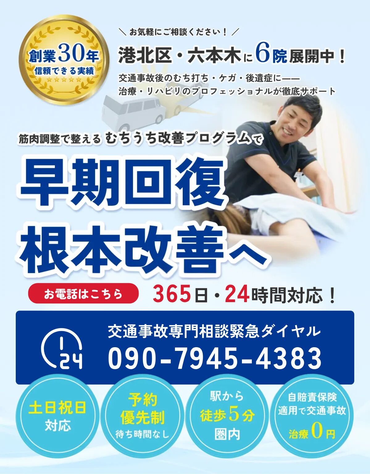当院では交通事故後の面倒な手続き、保険会社への対応、警察での事故手続きなど、交通事故に詳しいスタッフが親身にサポートさせて頂きます